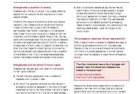 This briefing gives an overview of a rights-based approach to emergencies - what it means and how it works.  The briefing is framed around two key concepts central to ActionAid's work:  a) that providing relief in an emergency is not an end in itself. Any emergency work should protect and promote the human rights of those affected, and b) that emergency interventions should always be based on recognised legal and moral principles. Otherwise the intervention is in danger of doing more harm than good.